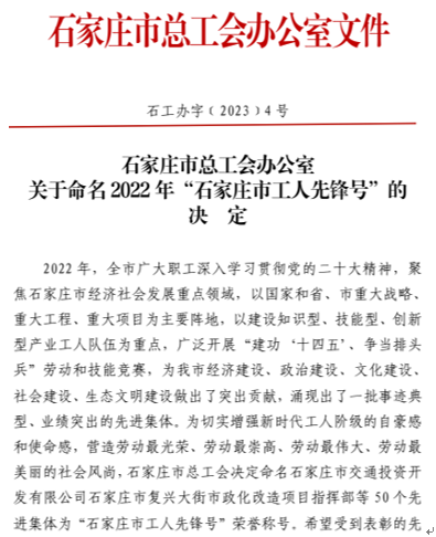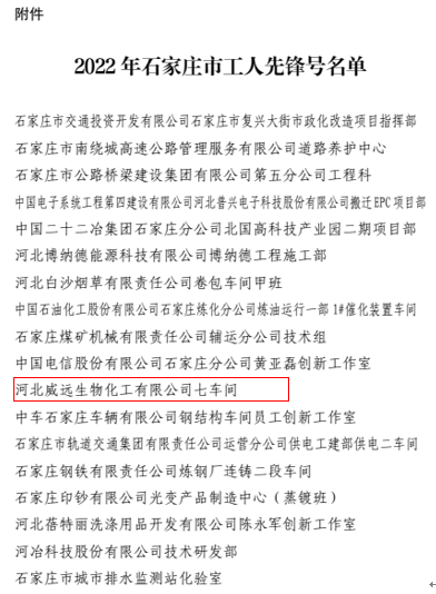 新年傳喜訊,近日,石家莊市總工會(huì)辦公室下發(fā)《關(guān)于命名 2022 年“石家莊市工人先鋒號(hào)”的決定》,河北威遠(yuǎn)生物化工有限公司七車間在2022年石家莊市“工人先鋒號(hào)”評(píng)選中成功入圍,榮獲“石家莊市工人先鋒號(hào)”稱號(hào)。