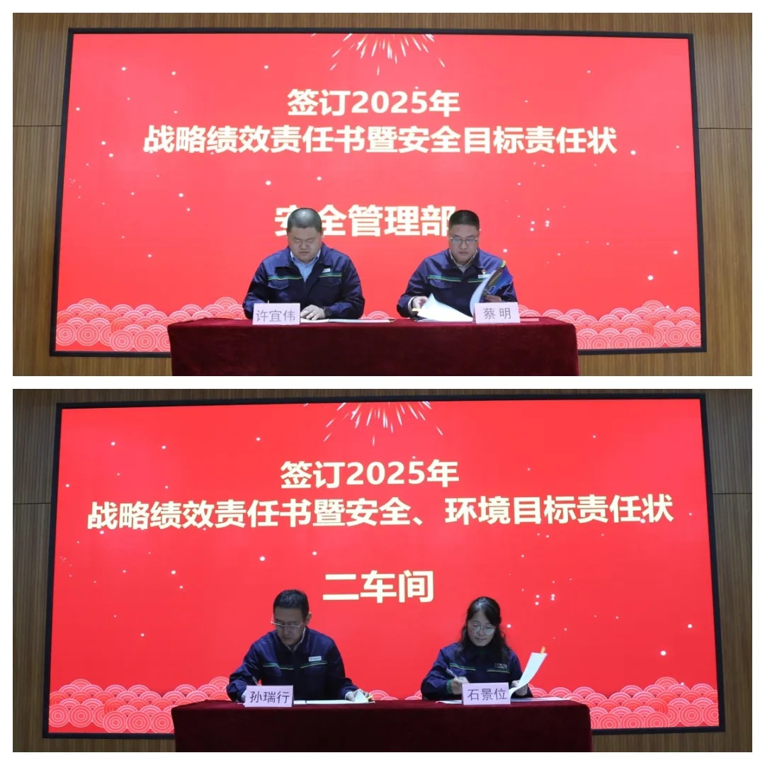 為扎實(shí)推進(jìn)落實(shí)2025年各項(xiàng)工作任務(wù),總經(jīng)理許宜偉分別與安全、環(huán)保、物流、生產(chǎn)管理分管領(lǐng)導(dǎo)簽訂了績(jī)效責(zé)任書及安全、環(huán)境責(zé)任狀。副總經(jīng)理孫瑞行與車間代表五車間、二車間簽訂了責(zé)任書。